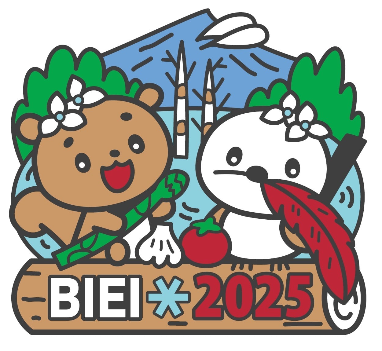 十勝岳と青い池を背景に美瑛町の特産品に囲まれたエゾリスとシマエナガが描かれています。